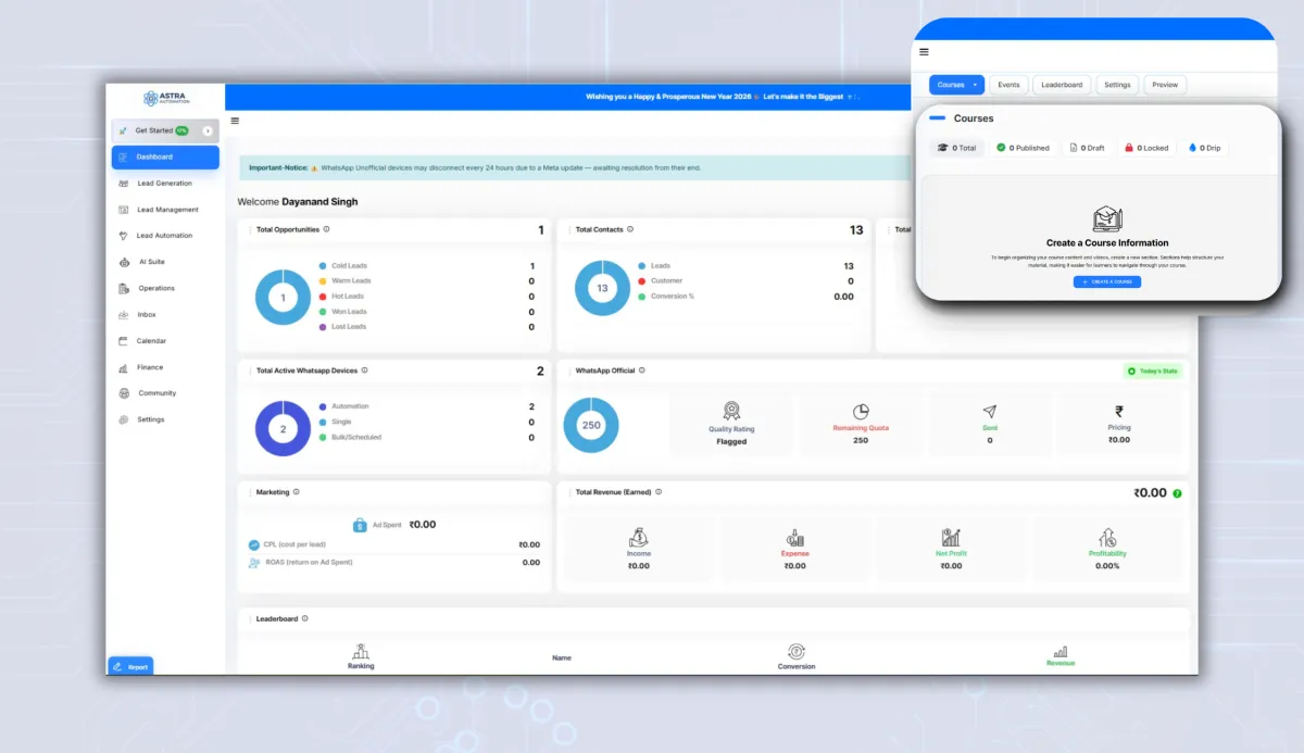 Astra Automation delivers a unified platform for CRM, messaging, automation, payments and course delivery so businesses manage everything in one place.